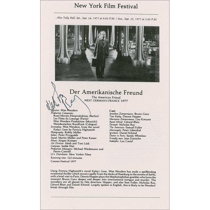 Influential director of such classic films as Rebel Without a Cause, Johnny Guitar, and King of Kings. His distinctive style was one of the prime motivating factors in the development of the “auteur” theory of filmmaking. Program from the 15th New York Film Festival, held at the Lincoln Center in 1977, 5.75 x 9, 30 pages, signed on an inside page for the film Der Amerikanische Freund, in which Ray played a “swindler,” in black ink by Ray. In fine condition, with light brush to last name of signature, and mild handling wear. Pre-certified PSA/DNA and RRAuction COA.