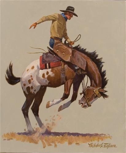 Nicholas S. Firfires (1919-1970), CAA. Breaking the Appalossa. 24" x 20" oil on canvas. Signed lower right. (est $3,000-4,000)