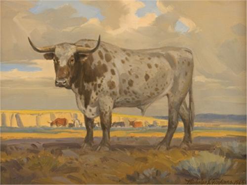 Nicholas S. Firfires (1919-1970), CAA. The Longhorn Bull, 1965. 12" x 16" oil on canvas. Signed lower right. (est $2,500-3,500)