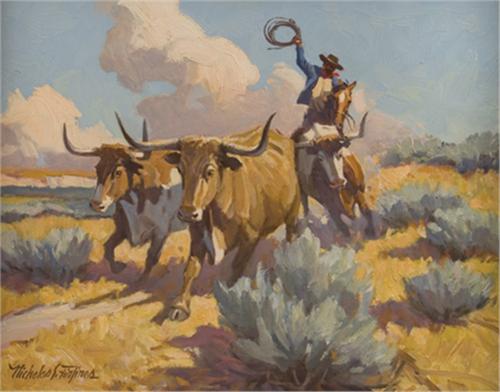 Nicholas S. Firfires (1919-1970), CAA. Gathering the Strays. 16" x 20" oil on canvas. Signed lower left. (est $3,000-4,000)