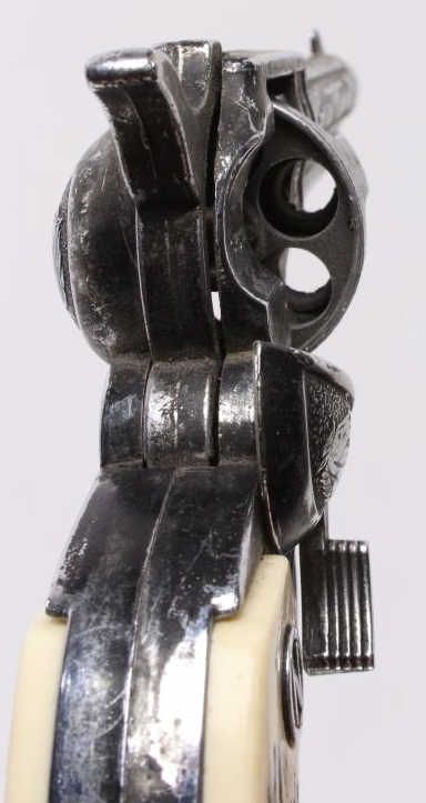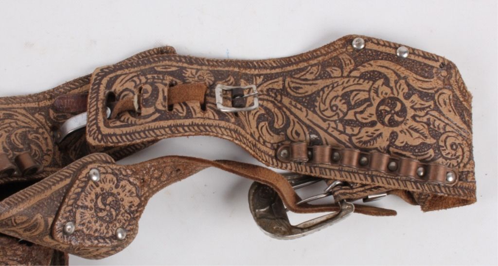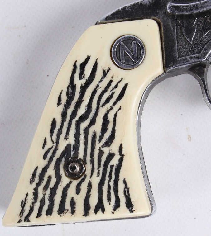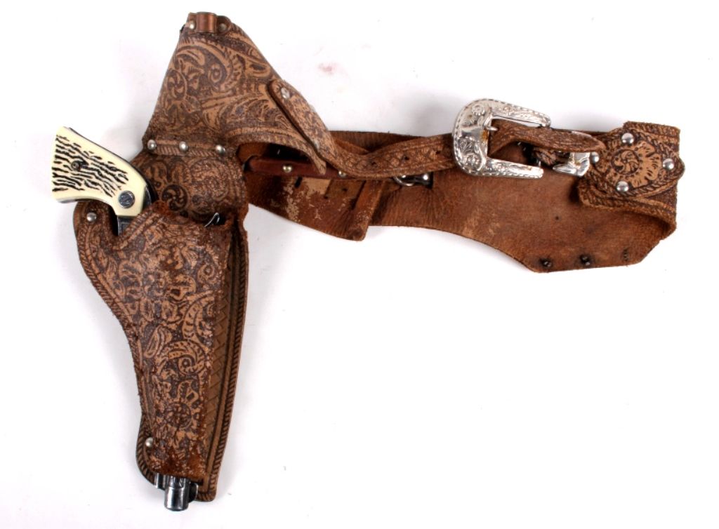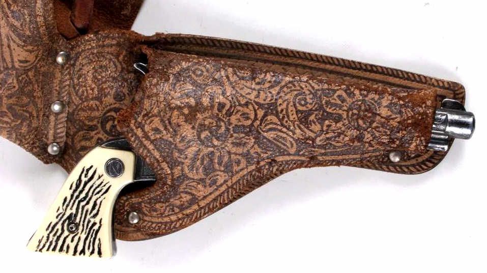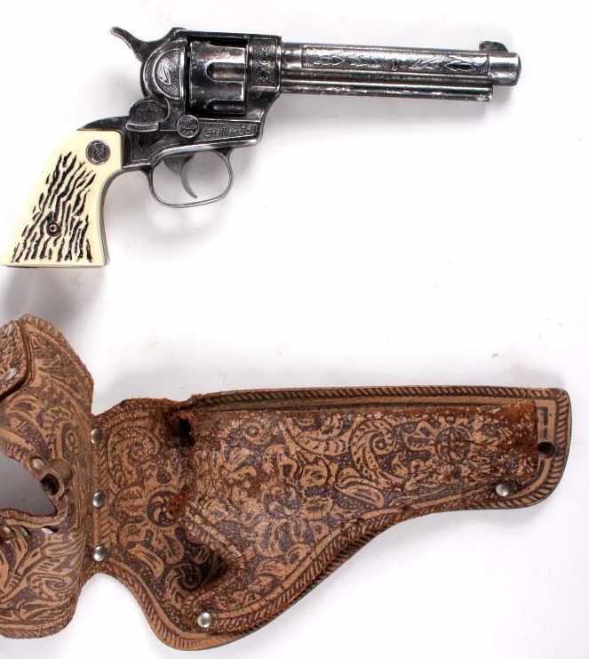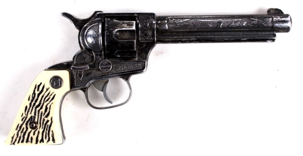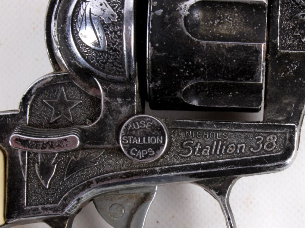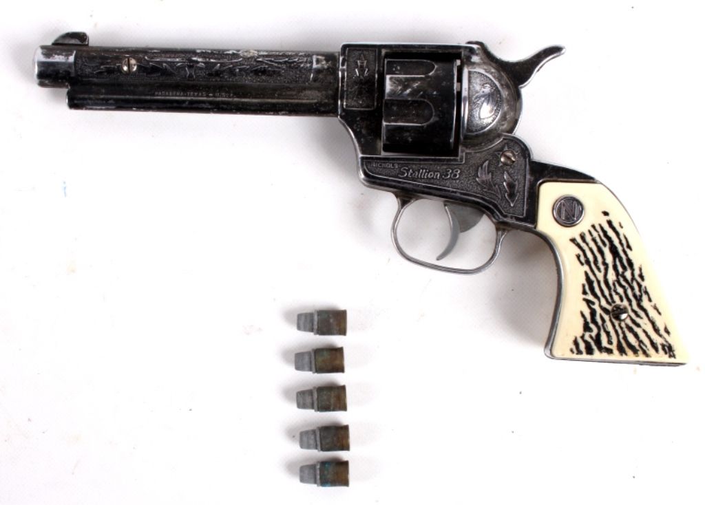 The lot shows a Nichols Stallion 38 Cap Gun and 5 brass casings with metal bullets. The gun also as what is believed to be the original holster. This is from circa 1950's and is a very well made piece. The gunmeasures 10" long.