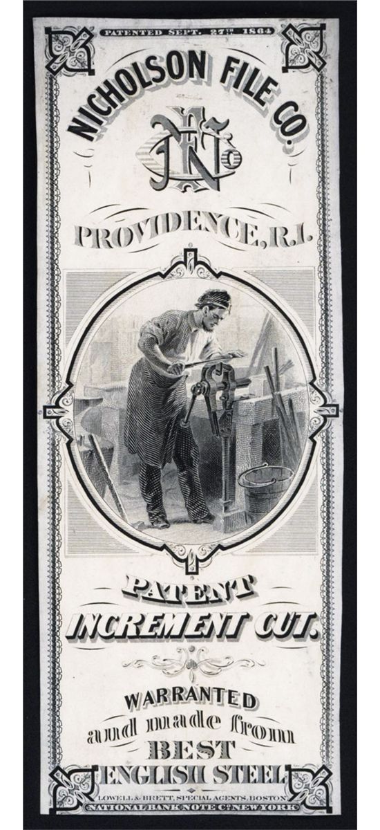 Providence, R.I., ND (ca.1860's), 2.25 x 6 inch package label for files by Nicholson File Co., black on india paper, worker filing something held in vise at work table, ornate borders with ÒPatented Sept. 27th, 1864Ó on top, Title of item is ÒPatent Increment Cut - Warranted and made from the best English SteelÓ, VF to XF condition, attractive and possibly unique as proof. NBNC.