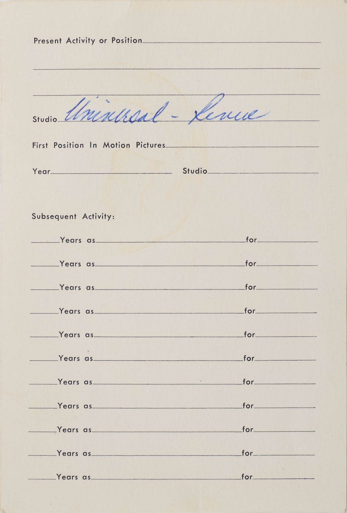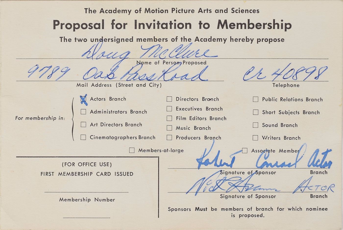 DS, signed “Nick Adams Actor,” one page, 6 x 4, no date. Academy of Motion Picture Arts and Sciences proposal for invitation to membership for Doug McClure in the actors branch, with McClure presumably filling out the upper field with his full name, address, and telephone number. Signed at the conclusion of the proposal by his two sponsors in Adams and Robert Conrad, both of whom add "Actor" after their signature. In fine condition.