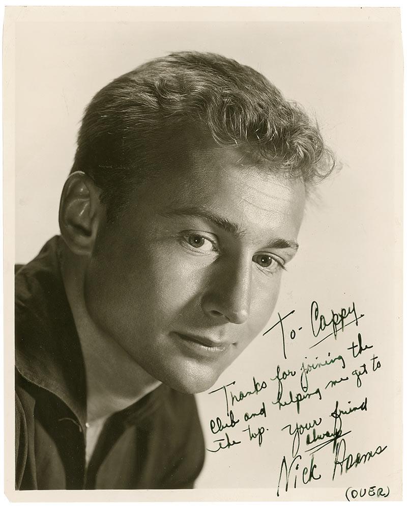 Talented American actor (1931–1968) who appeared in such films as Rebel Without a Cause and Twilight of Honor, for which he received an Academy Award nomination. He died of a prescription drug overdose at the age of 36. Vintage glossy 8 x 10 photo, signed and inscribed in fountain pen “To Cappy. Thanks for joining the club and helping me get to the top. Your friend always, Nick Adams.” Adams has added a postscript on the back of the image: “I remember your name from my fan mail. Thanks for writing. I’m sorry if I never answered my [mail]. I’m behind on my mail and its [sic] hard to answer everyone. Thanks. Nick.” Light creasing, scratches to the emulsions, a couple areas of staining, some irregular adhesion, and slight curling, otherwise fine condition.