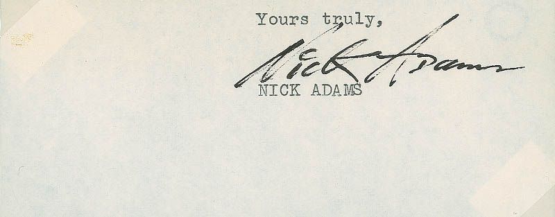 Ink signature, “Nick Adams,” on an off-white 5.25 x 2 slip clipped from the conclusion of a letter. In fine condition, with a light spot of soiling to the left border.