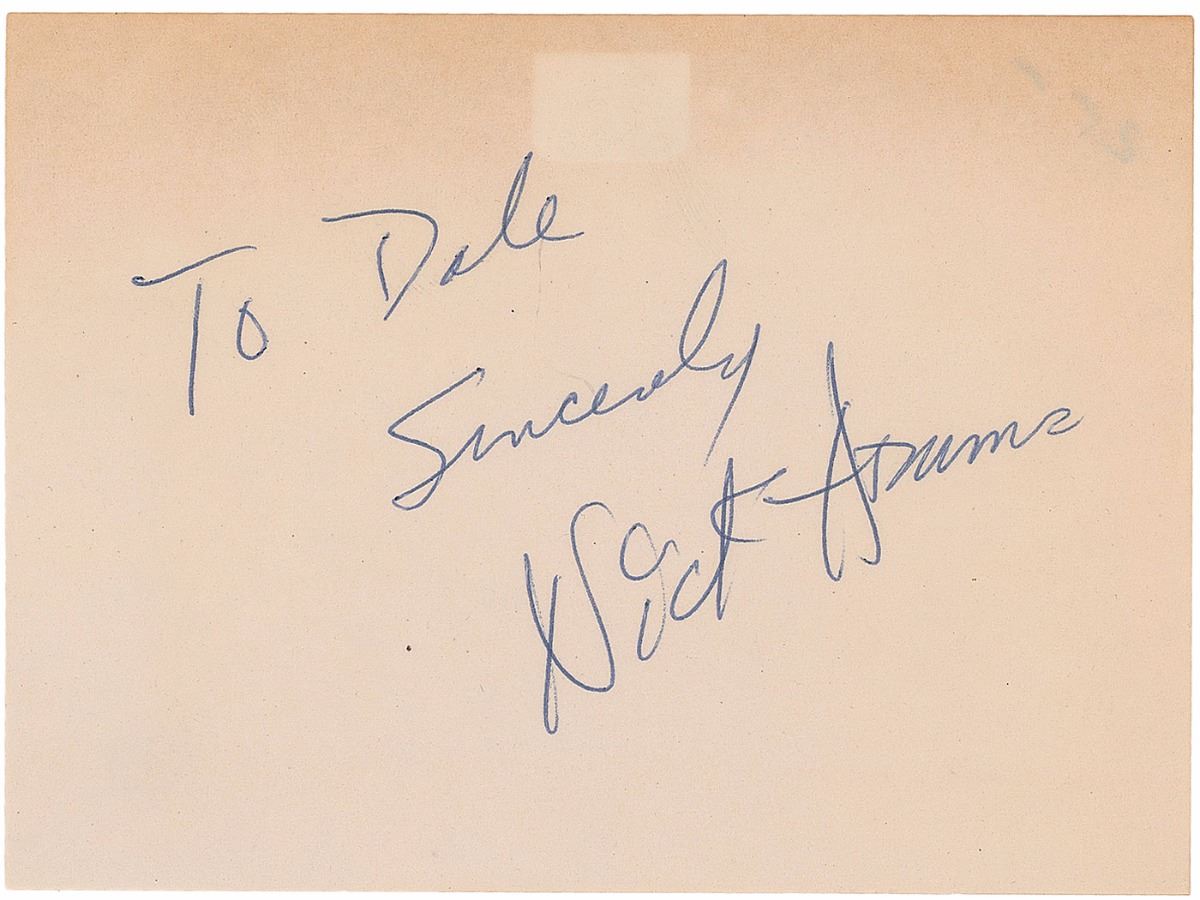 Talented American actor (1931–1968) who appeared in such films as Rebel Without a Cause and Twilight of Honor, for which he received an Academy Award nomination. He died of a prescription drug overdose at the age of 36. Ballpoint signature, “To Dale, Sincerely, Nick Adams,” on an off-white 4.75 x 3.5 sheet. In fine condition, with a box of irregular toning near top edge.