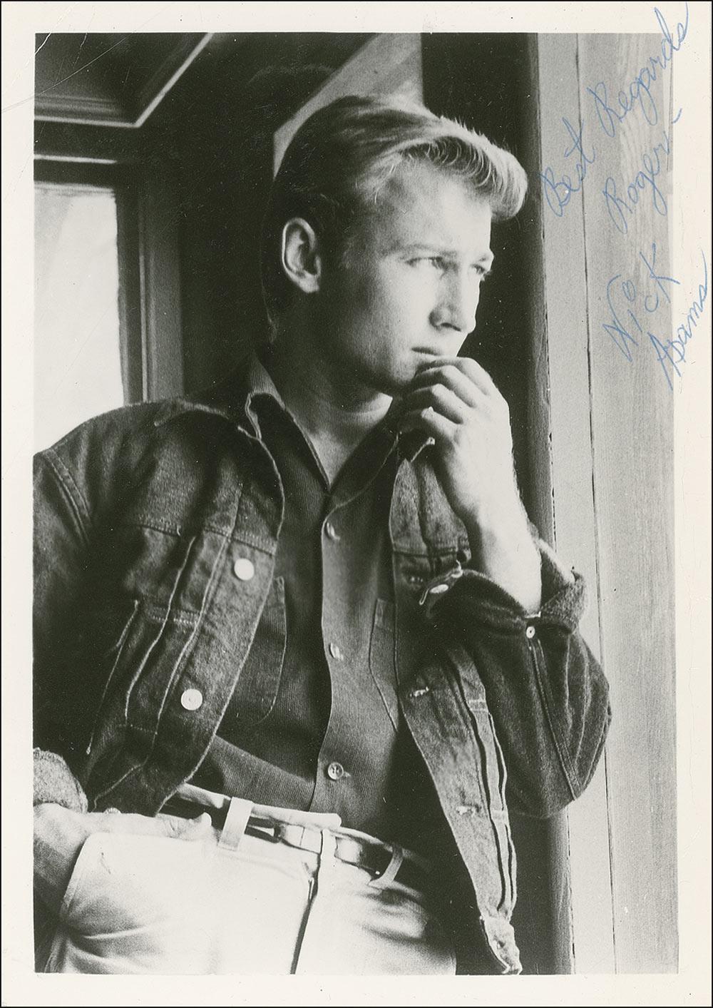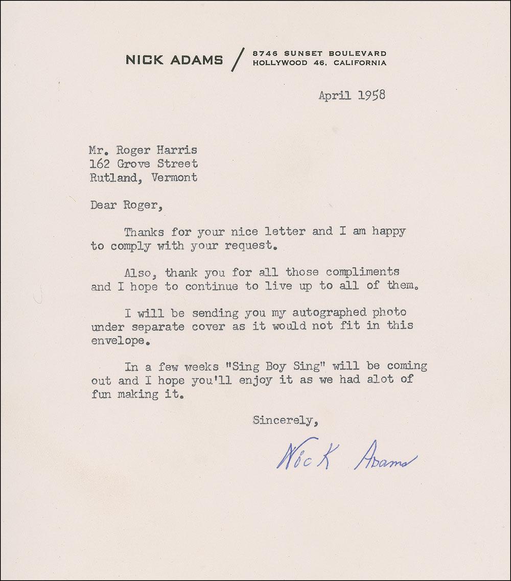 Vintage glossy 5 x 7 photo of Adams looking out a window, signed and inscribed in blue ballpoint, “Best regards Roger, Nick Adams”; and a TLS, one page, 6.5 x 7, dated April 1958 on his personal letterhead to an admirer. In part, “In a few weeks ‘Sing Boy Sing’ will be coming out and I hope you’ll enjoy it as we had a lot of fun making it.” Photo rates very good, with scattered creases, heavier to right edge, lightly affecting signature and inscription; letter rates fine condition.