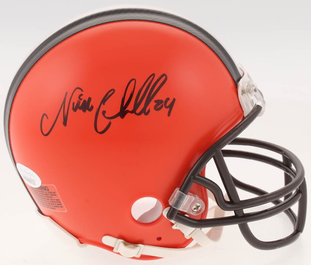 Riddell Cleveland Browns mini helmet. Hand-signed in black felt-tip pen by Nick Chubb.