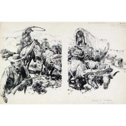 Nick Eggenhofer (1897-1985) (New Jersey) Drybrush Drawing. "Wagons To Nowhere." 13" x 20". Unsigned. Provenance Sticker From Midwestern Galleries. Est $1,800 - $2,200.