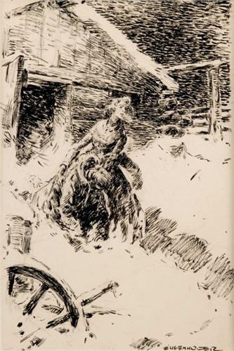 Nick Eggenhofer (1897-1985). 8" x 12". Pen & Ink Drawing. "Blizzard". Signed LR. (est $1,000-1,500). Provenance: Eggenhofer Estate.