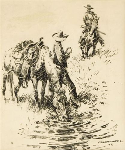 Nick Eggenhofer (1897-1985). "At the Waterhole". 11" x 9". Pen and Ink Drawing. Dated 1943. (est $1,500 - 2,500)