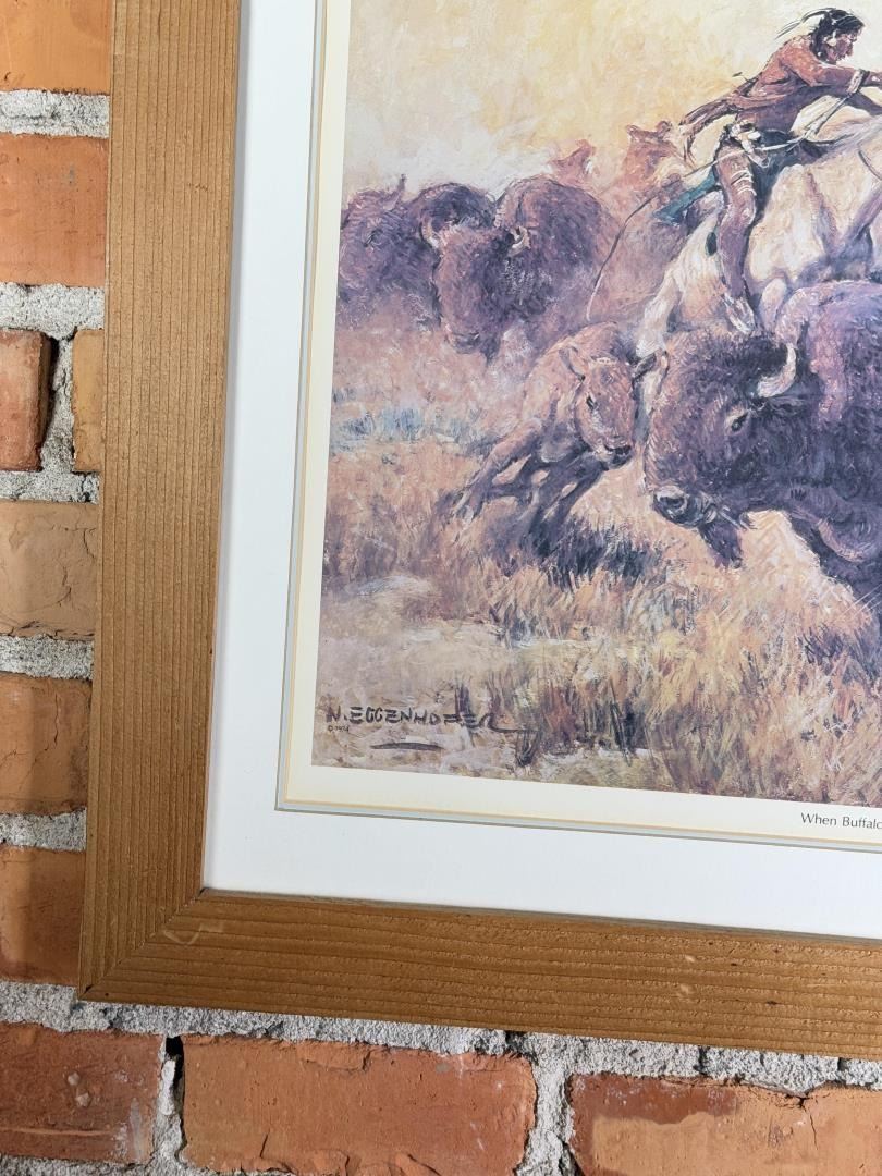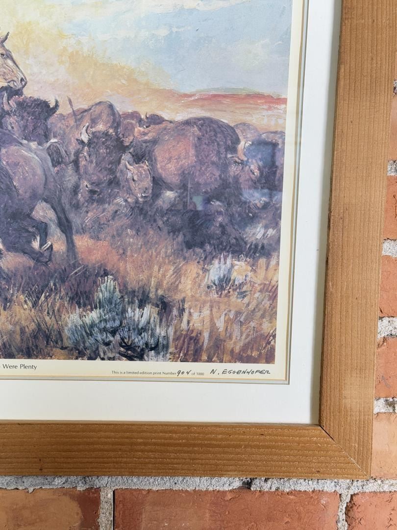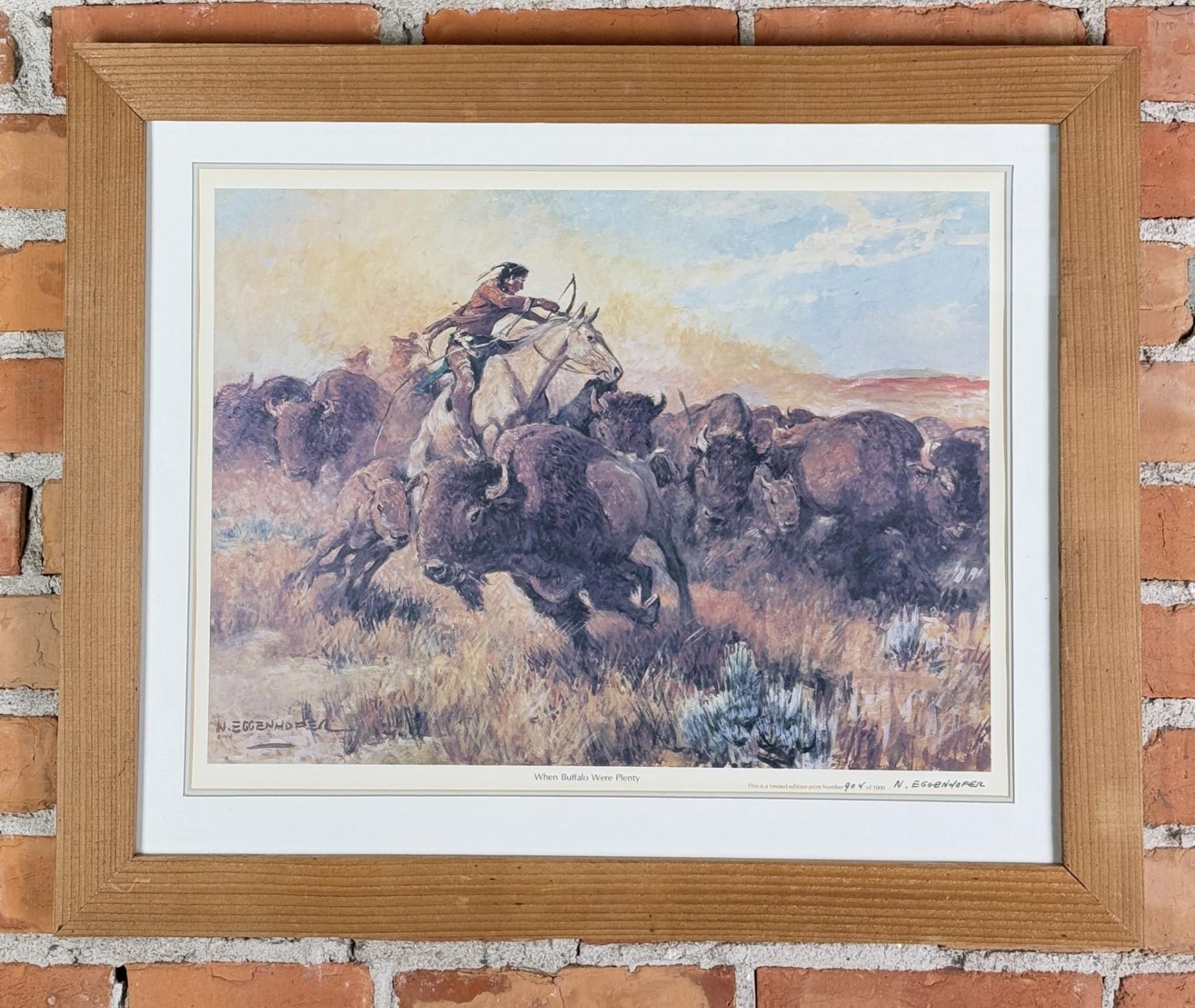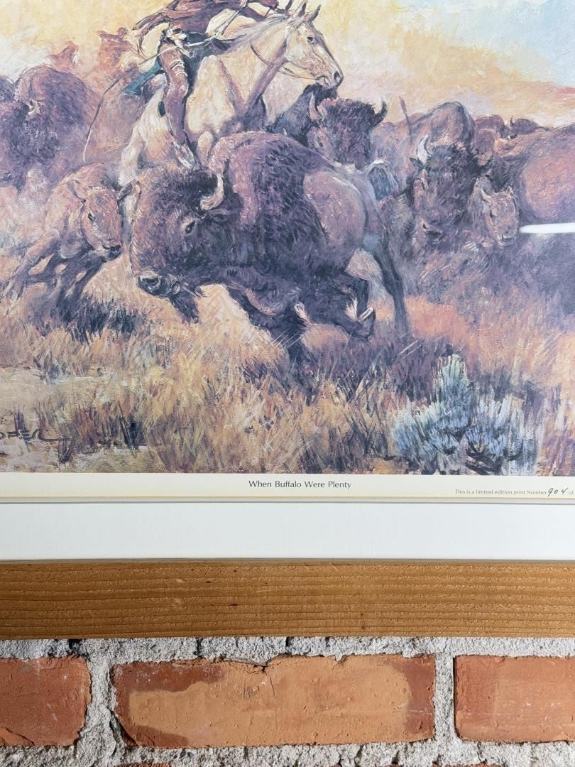 26" by 21 1/2" framed. Title is When Buffalo Were Plenty. Signed and Numbered.
