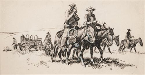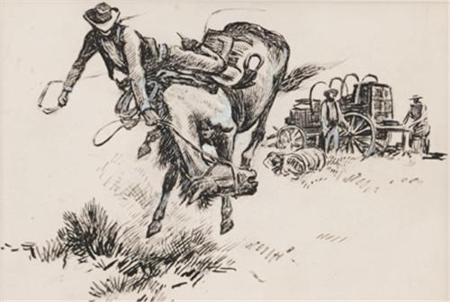 Nick Eggenhofer (1897-1985). Six Pen & Ink Drawings in Come and Get It by Ramon Adams and the book. (1) Coffee Grinder. 3 1/2" x 3 1/2". Unsigned. Page 15. (2) Jug and Branding Iron. 3 3/4" x 5". Unsigned. Page 121. (3) Bucking Bronc and Rider. 5 1/4" x 7 7/8". Unsigned. Page 162. (4) Horses and Riders. 5" x 9 1/2". Unsigned. Page 83. (5) Horse Running Through Camp. 7" x 9". Signed lower right. Page 29. (6) Come and Get It Cook. 7 1/4" x 10". Signed lower right. Page 143. (7) Come an' Get It book. (est $4,000-5,000)