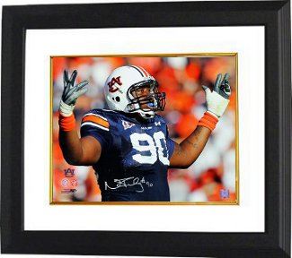 Nick Fairley played defensive tackle for the Auburn Tigers. He is considered one of the top defensive lineman prospects for the 2011 NFL Draft. In 2010, he became the 2nd player from Auburn to win the Lombardi Award. He was coached by Lombardi winner and former Auburn player Tracy Rocker, and became the first player to win the Lombardi and be coached by a winner of the award. During the 2011 BCS National Championship Game against the Oregon Ducks, Fairley had five tackles, three behind the line of scrimmage, a sack and a forced fumble earning the defensive player of the game award. Nick Fairley has hand signed this Auburn Tigers 16x20 Photo. Tri-Star Productions Hologram and Certificate of Authenticity. Custom White Mat and Premium Black Frame as shown.