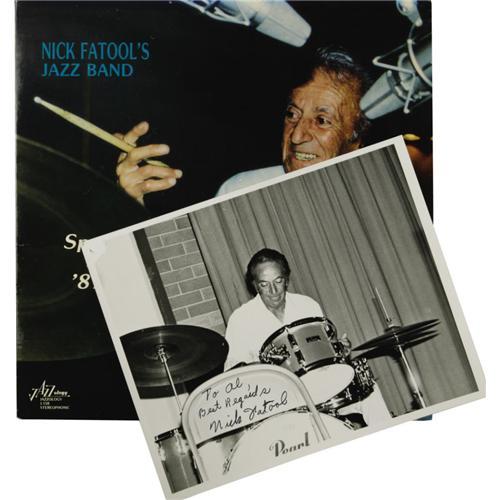 <B>Nick Fatool and Bob Haggart Signed Record and Photo Group.</B></I> The all-important rhythm section takes the limelight in this lot featuring drummer Nick Fatool and bassist Bob Haggart. Nick Fatool made his reputation as the tasteful, but driving drummer behind the Benny Goodman Sextet in the late thirties and early forties. "Nick Fatool's Jazz Band - Spring of '87" (Jazzology J-158) with its cover signed by Bob Haggart (and a signed photo of Nick Fatool). <I>From the Al White Jazz autograph archive.</B></I><BR><BR><b>Shipping:</b> Recordings (<a target="_blank" href="http://www.heritageauctions.com/common/shipping.php">view shipping information</a>)