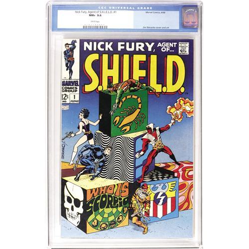 <B>Nick Fury, Agent of SHIELD #1 (Marvel, 1968) CGC NM+ 9.6 White pages.</B></I> Jim Steranko wrote, penciled, and even colored this issue - check out Steranko's work on the cover in all its pop-art glory. Also seen on the cover is the villain Scorpio, who made his first appearance here. Overstreet 2006 NM- 9.2 value = $150. CGC census 5/06: 79 in 9.6, 17 higher. <BR><BR><B>Important notice:</B> Heritage usually auctions material at the rate of 200-250 lots per hour. On some occasions eBay Live bid software or the Internet may not be able to keep up with the pace of the auction. We recommend placing a realistic absentee bid now as insurance to avoid disappointment. Occasionally the auctioneer may eliminate or reject an eBay Live bid, and the auctioneer may also reopen a lot after the close of the eBay live bidding (usually because we missed an audience bid), and may reject your bid even if it shows you as the winning bidder. By bidding via eBay Live, you agree that Heritage may award the lot to another bidder at its sole discretion under the circumstances described above or any other reasonable circumstances. Since eBay bids are not shown to us until we open the lot on the floor, we treat those bids just like floor bids. In most cases the floor responds before the eBay bid is presented to us, due to Internet lag time, so for consistency we have made it a policy that floor bids are always considered first over tie eBay live bids. Also please note that all Heritage lots purchased through eBay Live carry a 22.5% Buyer's Premium. Please make sure you read the Terms and Conditions before you bid. This lot is being auctioned in conjunction with a live floor auction by Heritage Auction Galleries. All final auction and invoice information will be supplied by Heritage Auction Galleries, and all other information should be considered preliminary. Lot:41001 <BR><BR><B>Winning Notification and Billing:</B> After the FINAL session in this auction is complete, Heritage will send e-mail and snail mail invoices. This process normally takes several days. All final auction and invoice information will be supplied by Heritage Auction Galleries, and all other information should be considered preliminary. <BR><BR>This auction will be conducted on a live auction floor and over the Internet through eBay Live. If you choose to place an absentee bid, please take a moment to <font color='#0000ff'><u><a href='http://pages.ebay.com/liveauctions/help/before/laabsentee.html'>learn how eBay Live absentee bidding works</a></u></font><font color='#000000'>