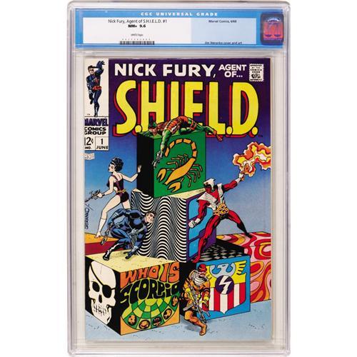 <B>Nick Fury, Agent of SHIELD #1 (Marvel, 1968) CGC NM+ 9.6 White pages.</B></I> The one and only Jim Steranko came up with visuals for this series unlike any that had been seen in comics before. Steranko also wrote and even colored the issue. Also seen on the cover is the villain, Scorpio, who makes his first appearance here. Overstreet 2006 NM- 9.2 value = $150. CGC census 3/07: 81 in 9.6, 17 higher.<BR><BR><b>Shipping:</b> Slabbed Comic (<a target="_blank" href="http://www.heritageauctions.com/common/shipping.php">view shipping information</a>)