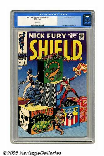<B>Nick Fury, Agent of SHIELD #1 (Marvel, 1968) CGC NM+ 9.6 White pages.</B></I> The one and only Jim Steranko came up with visuals for this series unlike any that had been seen in comics before. Steranko also wrote and even colored the issue. Also seen on the cover is the villain Scorpio, who made his first appearance here. Overstreet 2005 NM- 9.2 value = $140. CGC census 7/05: 81 in 9.6, 16 higher.