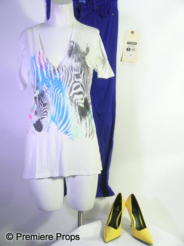 Caroline (Ari Graynor) white s/s with zebra graphic on front v-neck "The Beautiful" shirt (size M), electric blue five pocket denim "BDG" jeans (size 25) Yellow leather pointed toe "Bakers" shoes (Size 8) (Screen worn/includes wardrobe tag)