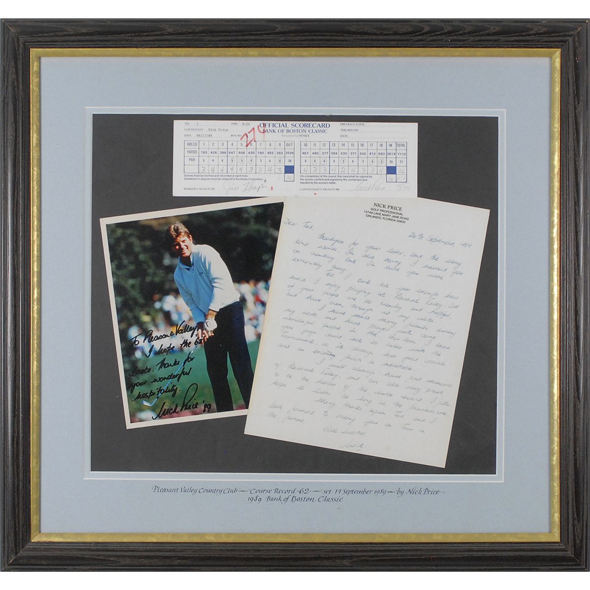 Three items related to Price’s record-setting performance at the 1989 Bank of Boston Classic, held at the Pleasant Valley Country Club: ALS signed “Nick,” one page, 8.5 x 11, personal letterhead, September 26, 1989, in part: “I can’t tell you enough how much I enjoy playing at Pleasant Valley. All of your people are so friendly and helpful…I will always have fond memories of Pleasant Valley, and am also proud to be the holder of the course record”; color 8 x 8.75 photo of him on the course, signed and inscribed in black ink, “To Pleasant Valley, I hope the 62 lasts. Thanks for your wonderful hospitality. Nick Price, ’89”; and his official scorecard for the record-setting score of 62, 10 x 3, signed in pencil by Price. Mounted, double-matted, and framed to an overall size of 25 x 23. In overall fine condition.