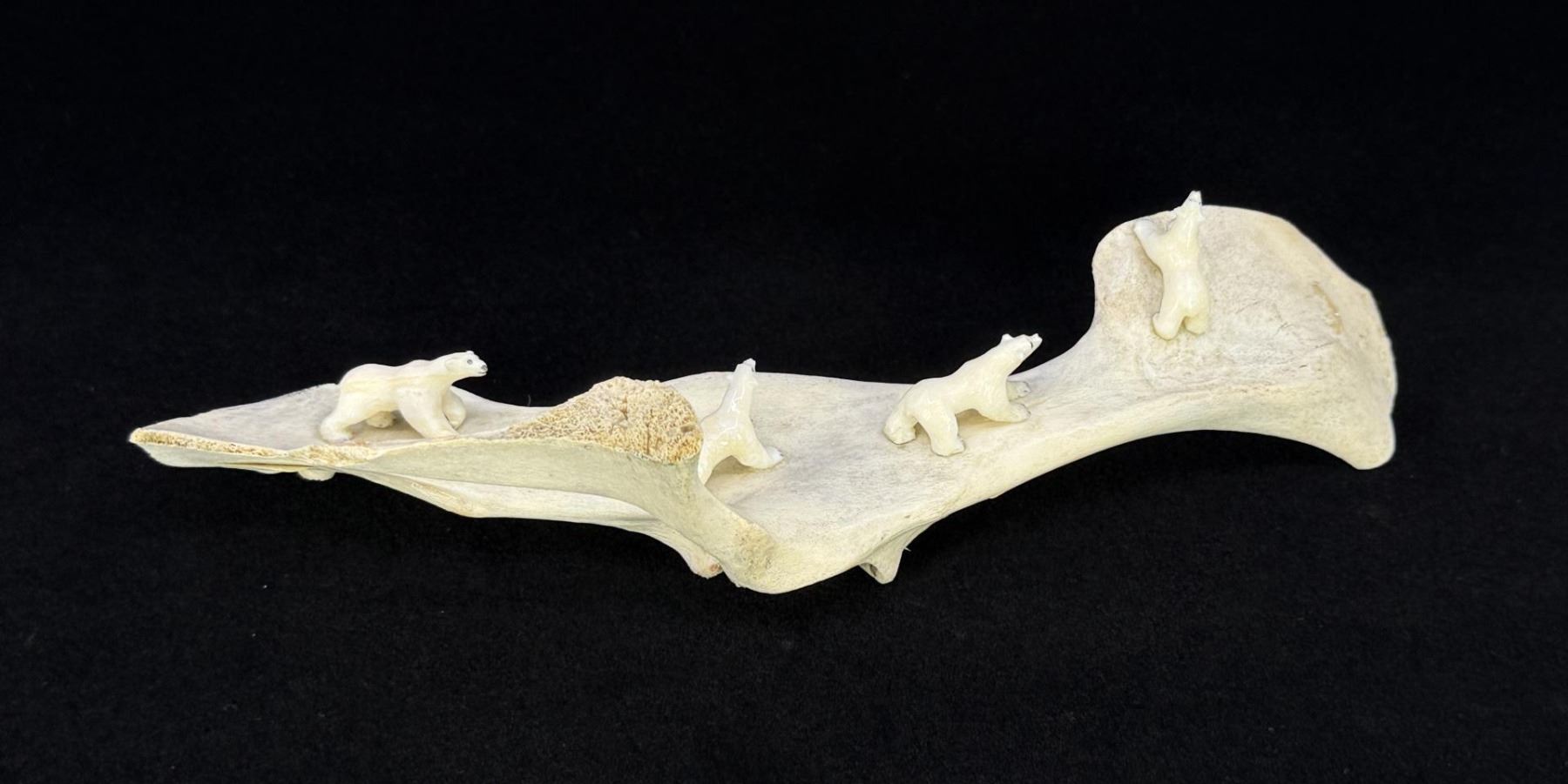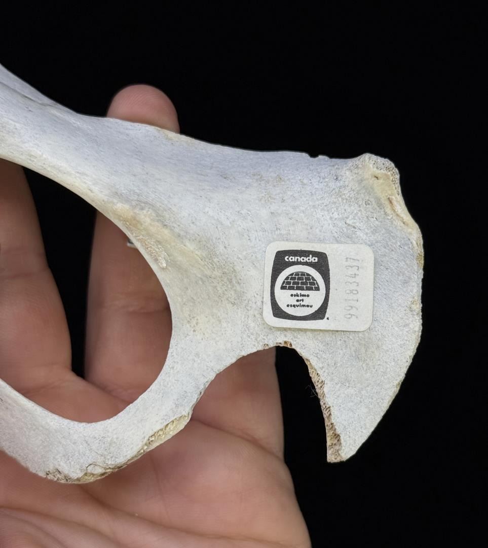9 5/8" by 3 1/8" by 2 1/8". Carved Walrus Ivory and Caribou Antler. Native made prior to 1972. This item cannot be shipped to Oregon, California, Hawaii, New York, New Jersey, Internationally, or any other state that prohibits. Provenance: Heard Museum, Arizona; Private Collection, New York.