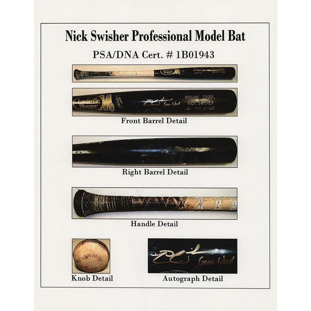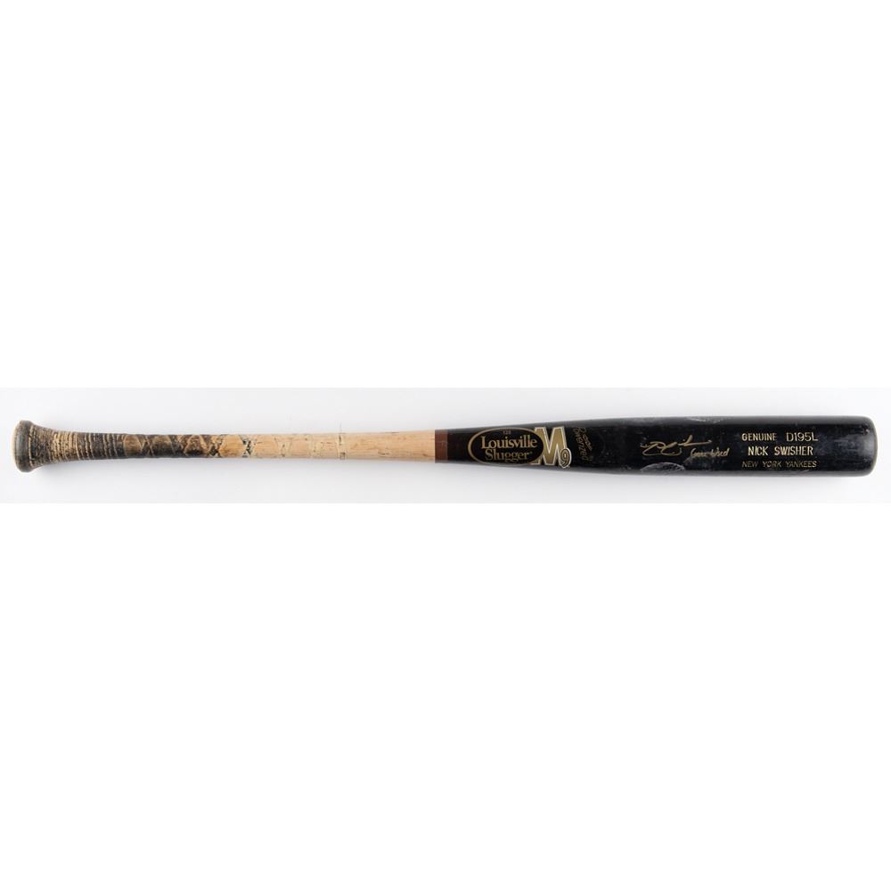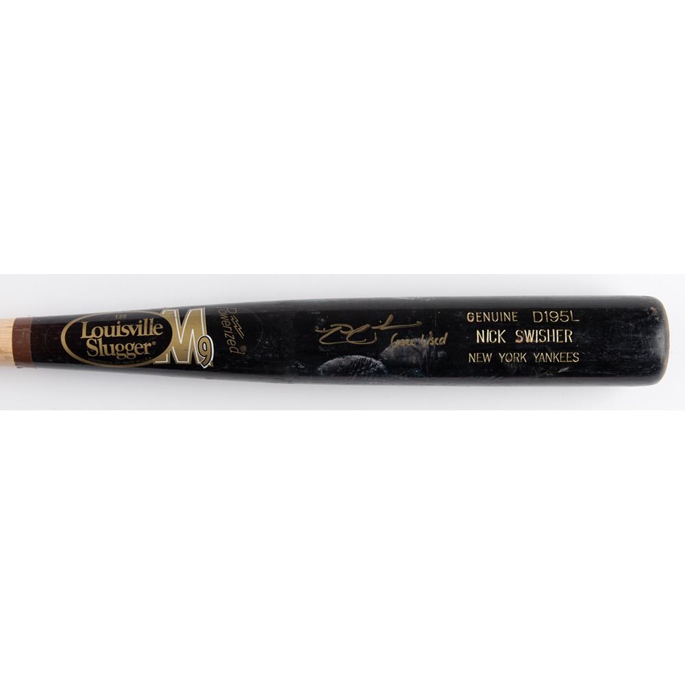 Nick Swisher's game-used personalized Louisville Slugger M9 baseball bat, used by Swisher as a member of the New York Yankees during the 2010 season, signed on the barrel in gold ink, “Nick Swisher, Game Used.” In very good to fine condition, with obvious expected signs of use, such as ball marks and scuffs, stitch impressions, and cleat marks. Accompanied by a full letter of authenticity from PSA/DNA, which grades the bat “PSA GU 10” and concludes that “the bat is authentic, and was game used by Swisher during the referenced labeling period.” The 2010 season was the best of Swisher’s career. He made his first and only All-Star Game appearance and was instrumental to New York’s regular-season success, scoring 91 runs, mashing 29 home runs, and connecting on 163 base hits.
