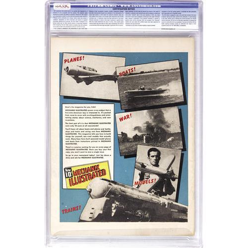 <B>Nickel Comics #1 (Fawcett, 1940) CGC VF- 7.5 Off-white to white pages.</B></I> Bulletman made his first appearance in this issue, which also tells the character's origin story (he not only invents a serum that gives him superpowers, but also comes up with his gravity-defying helmet). While that in itself makes this issue a key, the title tells you what was unique about this series -- it was half the price of the usual comic, with half the content (32 pages, which later became the norm), and appearing every two weeks. The concept didn't catch on, but Bulletman was successful enough that he went on to be the star of <B>Master Comics</B></I> and even had his own title for a while. The cover of this premiere issue is by Jack Binder. Overstreet 2006 VF 8.0 value = $2,600. CGC census 5/06: 1 in 7.5, 3 higher. <BR><BR><B>Important notice:</B> Heritage usually auctions material at the rate of 200-250 lots per hour. On some occasions eBay Live bid software or the Internet may not be able to keep up with the pace of the auction. We recommend placing a realistic absentee bid now as insurance to avoid disappointment. Occasionally the auctioneer may eliminate or reject an eBay Live bid, and the auctioneer may also reopen a lot after the close of the eBay live bidding (usually because we missed an audience bid), and may reject your bid even if it shows you as the winning bidder. By bidding via eBay Live, you agree that Heritage may award the lot to another bidder at its sole discretion under the circumstances described above or any other reasonable circumstances. Since eBay bids are not shown to us until we open the lot on the floor, we treat those bids just like floor bids. In most cases the floor responds before the eBay bid is presented to us, due to Internet lag time, so for consistency we have made it a policy that floor bids are always considered first over tie eBay live bids. Also please note that all Heritage lots purchased through eBay Live carry a 22.5% Buyer's Premium. Please make sure you read the Terms and Conditions before you bid. This lot is being auctioned in conjunction with a live floor auction by Heritage Auction Galleries. All final auction and invoice information will be supplied by Heritage Auction Galleries, and all other information should be considered preliminary. Lot:41001 <BR><BR><B>Winning Notification and Billing:</B> After the FINAL session in this auction is complete, Heritage will send e-mail and snail mail invoices. This process normally takes several days. All final auction and invoice information will be supplied by Heritage Auction Galleries, and all other information should be considered preliminary. <BR><BR>This auction will be conducted on a live auction floor and over the Internet through eBay Live. If you choose to place an absentee bid, please take a moment to <font color='#0000ff'><u><a href='http://pages.ebay.com/liveauctions/help/before/laabsentee.html'>learn how eBay Live absentee bidding works</a></u></font><font color='#000000'>