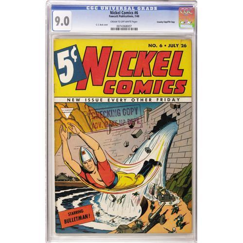 <B>Nickel Comics #6 Crowley Copy/File Copy (Fawcett, 1940) CGC VF/NM 9.0 Cream to off-white pages.</B></I> A C. C. Beck cover fronts this Crowley File Copy and a Checking Copy stamp appears on the cover. Overstreet 2006 VF/NM 9.0 value = $769; NM- 9.2 value = $1,050. CGC census 10/06: 1 in 9.0, 1 higher.<BR><BR><b>Shipping:</b> Slabbed Comic (<a target="_blank" href="http://www.heritageauctions.com/common/shipping.php">view shipping information</a>)