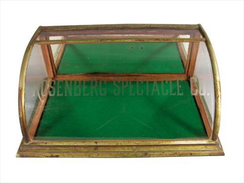 Nickel Curved Glass Showcase for the Rosenberg Spectacle Company. Interior etched glass, broken glass on one side and nickel is worn otherwise good condition. 35 X 12 X 23 inches.