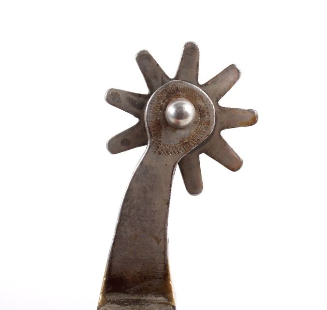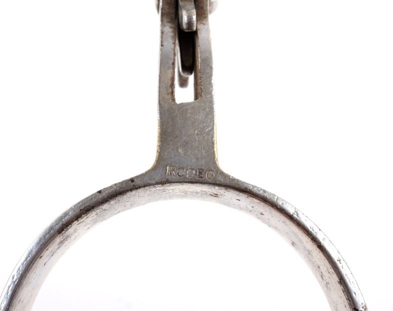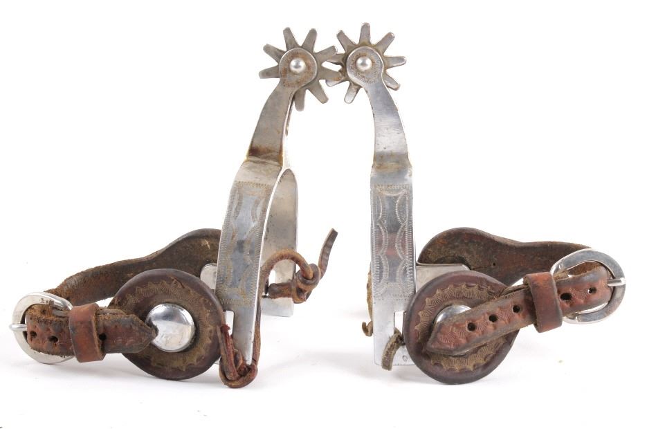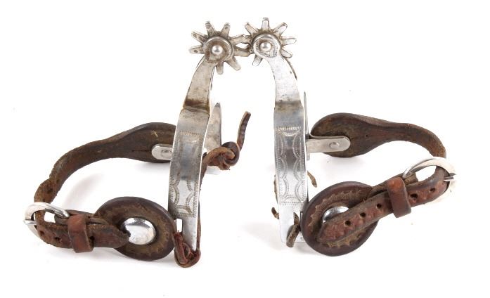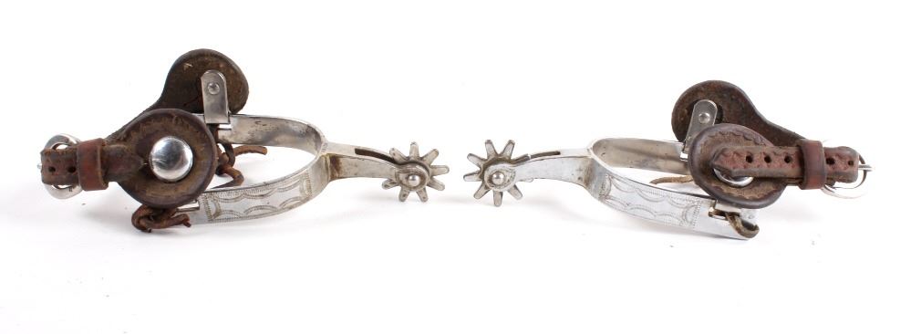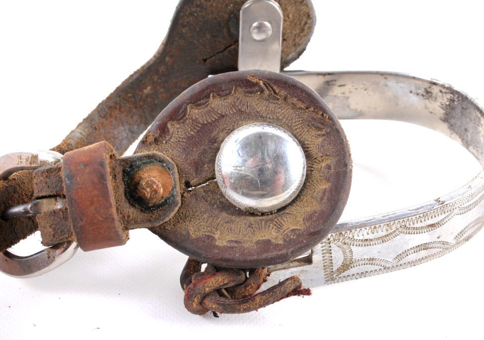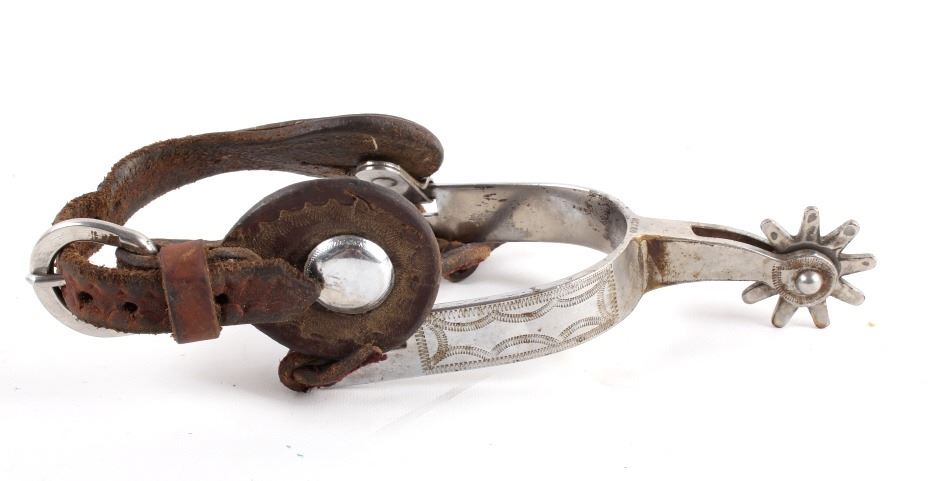 Included in this lot we have a pair of nickel finished rodeo spurs. The spurs are iron with a nickel finish and detailed engravings on the outside edge. The spur also shows a 9 point star at the end of each shank and are marked "RODEO". The spurs also include a leather strap with metal buckle and patterned strap. The spurs are in good condition overall with some signs of wear and use. The pieces measures 3" wide by 8" long (with the strap).