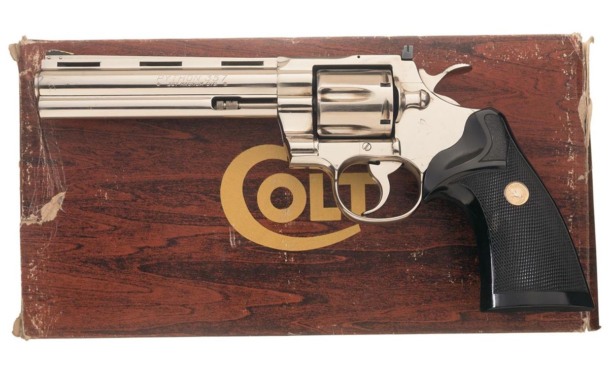 Manufactured in 1988. Fixed front sight, adjustable rear sight, serrated trigger and checkered hammer with standard markings. Fitted with checkered rubber grips with gold Colt medallions. Complete with a factory "wood grained" box hand numbered to the gun
