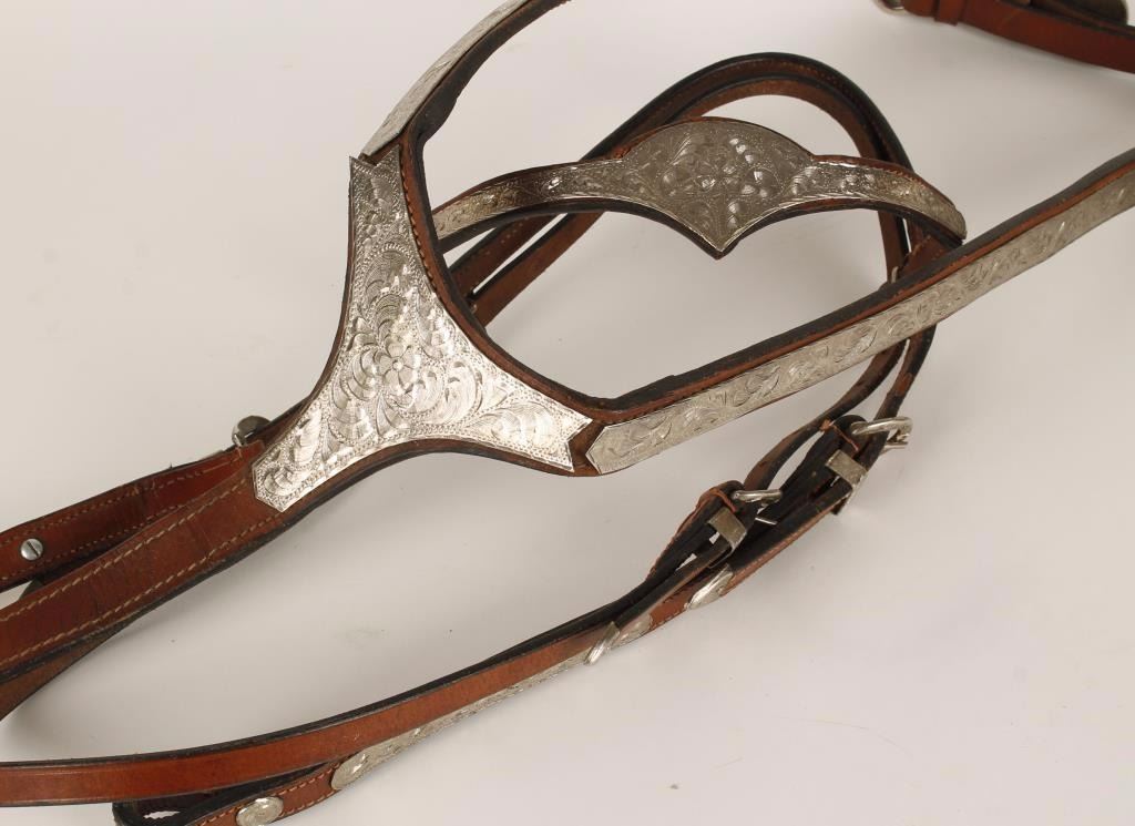 Brown leather with nickel plated floral, leaf and scroll etching. Good condition, shows some use and wear.