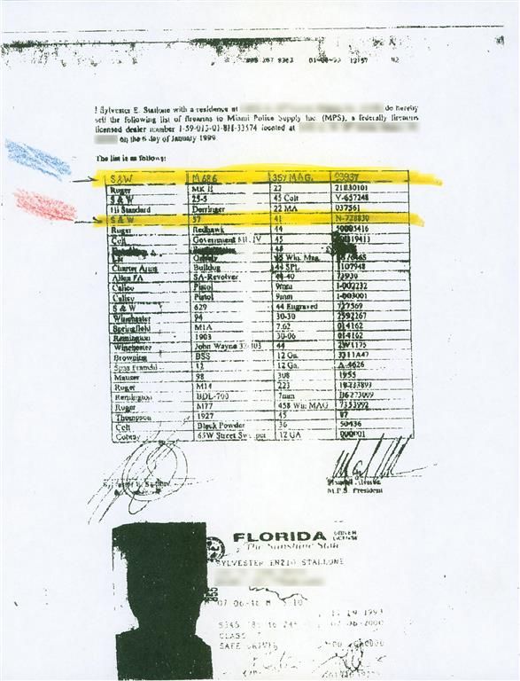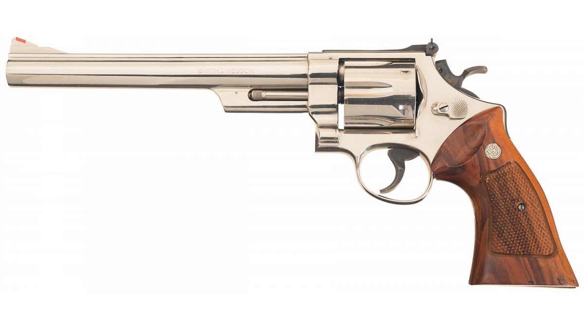 Manufactured in 1980. Ramped front sight with red insert and adjustable target rear sight with standard markings. Casehardened serrated target trigger and checkered hammer. Fitted with checkered goncalo alves grips with silver S&W medallions. Included is a photocopy of a affidavit signed by Sylvester Stallone that indicates his ownership and confirms the manufacture, model and serial number of the revolver.