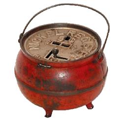 Nickel Register bank, cast iron 4 legged kettle w/bail handle, marked Pat. Apd., has approx. 75% of it's original red paint, VG condition, 5"H.