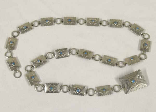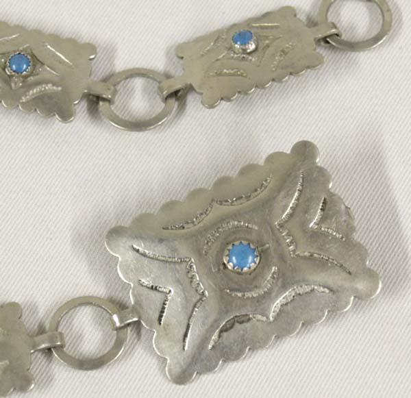 Nickel Silver Turquoise Concho Belt, measures approx. 31'' including buckle, buckle measures approx. 1 1/8" x 1.5". SHI $15.