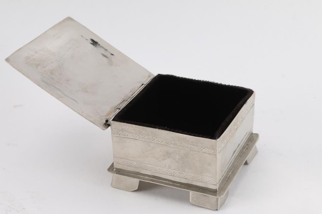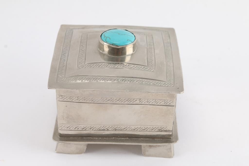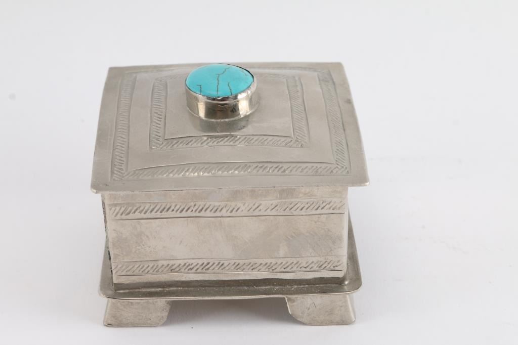 Lined in black felt, footed and stamped around edges. Has a round composite turquoise stone in center of top. Measures 2" x 3 1/2".