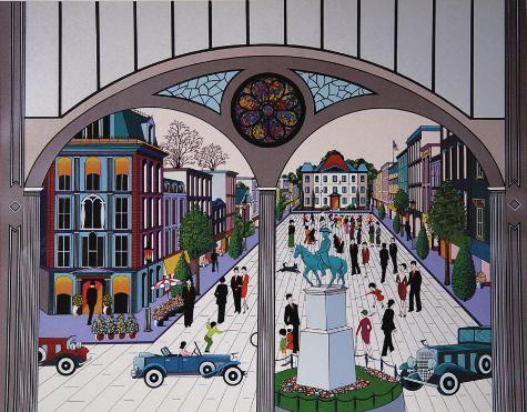 A master of detail, Nobou Watanabe applies meticulous definition to every face, tree and snowflake in his paintings. Watanabe was born in Japan and did not move to the United States until after he graduated college. His style incorporates the influence of his boyhood in Japan as well as "naif" styles and motifs.