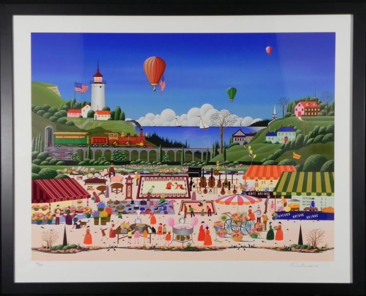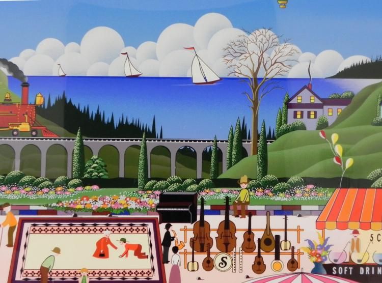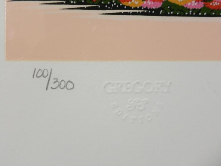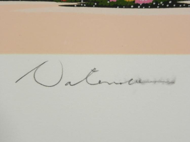 The intriguing finds of flea market sellers abound in this charmning art print. Artist: Nobou "Nicky" Watanabe Signature: In pencil, lower right Title: "Flea Market" Medium: Serigraph on paper Edition: Gregory Editions, numbered 100/300 with blind stamp, lower left Year: 1989 Image size: 24 x 32 inches Framing: In matte black wood grain frame Frame size: 30 1/2 x 38 inches Condition: Excellent Biography: A master of detail, Nobou Watanabe applies meticulous definition to every face, tree and snowflake in his paintings. Watanabe was born in Japan and did not move to the United States until after he graduated college. His style incorporates the influence of his boyhood in Japan as well as "naif" styles and motifs.