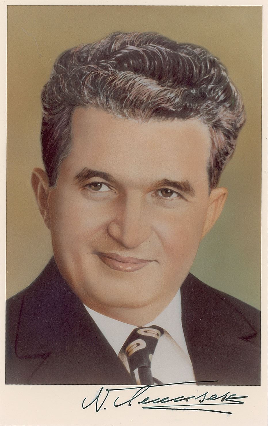Uncommon color glossy 5.5 x 9 photo of the Romanian head of state, signed in the lower border in fountain pen, "N. Ceau?escu." In very fine condition. Accompanied by the original mailing envelope, postmarked at Bucharest in 1974, and transmittal letter from an aide.