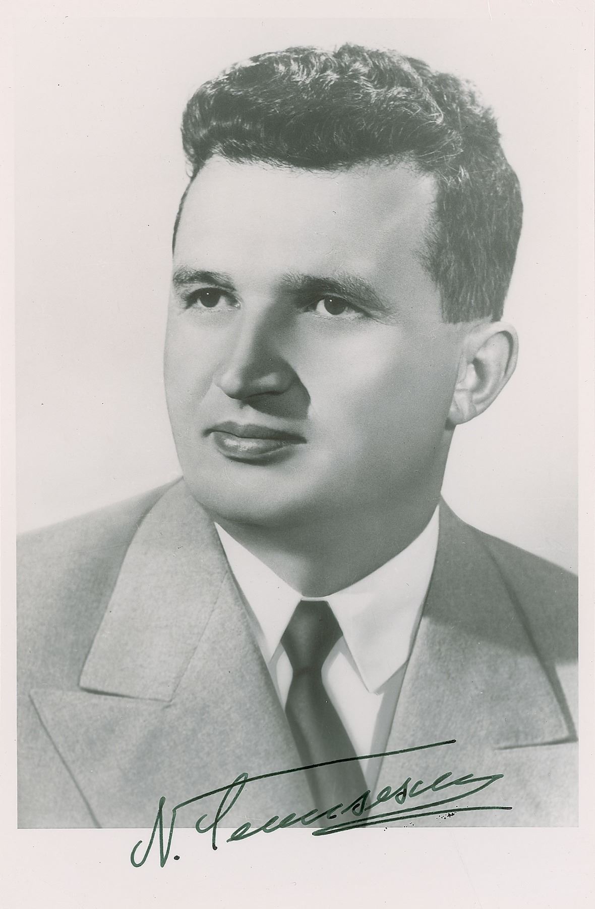 Glossy 5.5 x 8.5 photo of the Romanian head of state early into his career, signed in black felt tip, "N. Ceaușescu." In very good to fine condition, with scattered small creases. Accompanied by a transmittal letter in German, dated April 2, 1981.