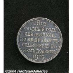 <B>Nicolas II Rouble 1912,</B></I> Y-68. Centennial of Napoleon's defeat. Choice AU. <BR><BR><B>Important notice:</B> Heritage usually auctions material at the rate of 200-250 lots per hour. On some occasions eBay Live bid software or the Internet may not be able to keep up with the pace of the auction. We recommend placing a realistic absentee bid now as insurance to avoid disappointment. Occasionally the auctioneer may eliminate or reject an eBay Live bid, and the auctioneer may also reopen a lot after the close of the eBay live bidding (usually because we missed an audience bid), and may reject your bid even if it shows you as the winning bidder. By bidding via eBay Live, you agree that Heritage may award the lot to another bidder at its sole discretion under the circumstances described above or any other reasonable circumstances. Since eBay bids are not shown to us until we open the lot on the floor, we treat those bids just like floor bids. In most cases the floor responds before the eBay bid is presented to us, due to Internet lag time, so for consistency we have made it a policy that floor bids are always considered first over tie eBay live bids. Also please note that all Heritage lots purchased through eBay Live carry a 20% Buyer's Premium. Please make sure you read the Terms and Conditions before you bid.