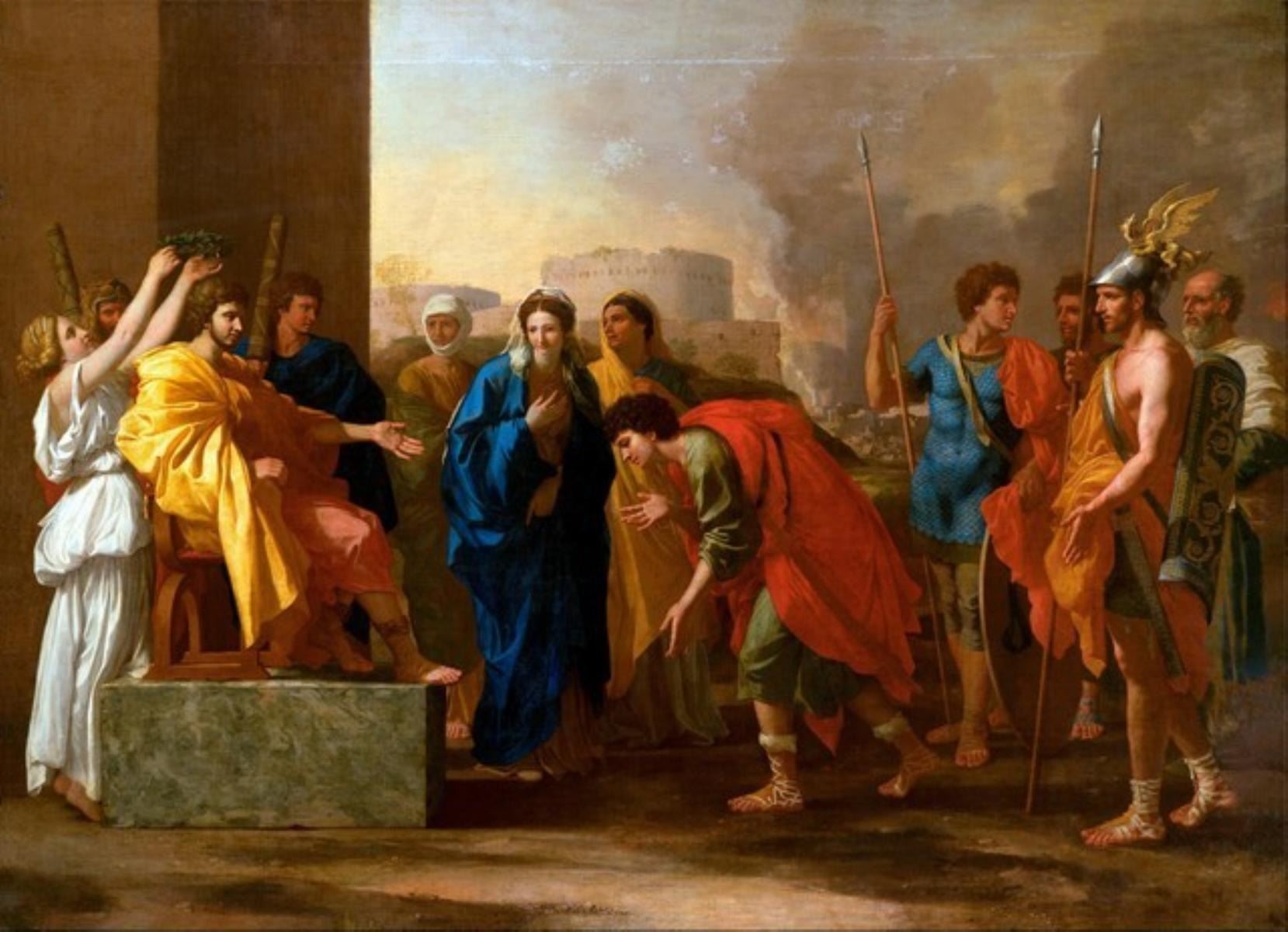 Artist: Nicolas Poussin - Title: The Continence of Scipio - Medium: Fine Art Reproduction Giclee on Canvas - Image Size: Approximately 23 inches x 32 inches - Unframed on Unstretched Canvas - Biography: Nicolas Poussin (June 1594 - 19 November 1665) was the leading painter of the classical French Baroque style, although he spent most of his working life in Rome. Most of his works were on religious and mythological subjects painted for a small group of Italian and French collectors. He returned to Paris for a brief period to serve as First Painter to the King under Louis XIII and Cardinal Richelieu, but soon returned to Rome and resumed his more traditional themes. In his later years he gave growing prominence to the landscapes in his pictures. His work is characterized by clarity, logic, and order, and favors line over color. Until the 20th century he remained a major inspiration for such classically-oriented artists as Jacques-Louis David, Jean-Auguste-Dominique Ingres and Paul Cézanne.