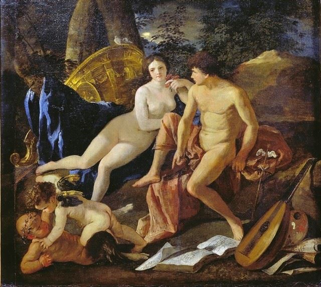 Artist: Nicolas Poussin - Title: Venus and Mercury - Medium: Fine Art Reproduction Giclee on Canvas - Image Size: Approximately 28.5 inches x 32 inches - Unframed on Unstretched Canvas - Biography: Nicolas Poussin (June 1594 - 19 November 1665) was the leading painter of the classical French Baroque style, although he spent most of his working life in Rome. Most of his works were on religious and mythological subjects painted for a small group of Italian and French collectors. He returned to Paris for a brief period to serve as First Painter to the King under Louis XIII and Cardinal Richelieu, but soon returned to Rome and resumed his more traditional themes. In his later years he gave growing prominence to the landscapes in his pictures. His work is characterized by clarity, logic, and order, and favors line over color. Until the 20th century he remained a major inspiration for such classically-oriented artists as Jacques-Louis David, Jean-Auguste-Dominique Ingres and Paul Cezanne.