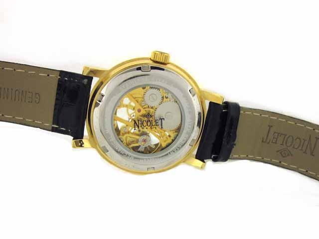 This is a Nicolet Men's Skeleton Automatic Stainless Steel Watch with genuine Crocodile Strap; Swiss SW200 Automatic 25-Jewel Movement; Sapphire Crystal and Screw down Crown. The Clasp is Push button with dual deployant. The Strap Measurements: 9-3/4"" L