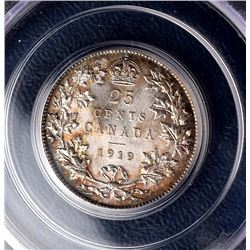 Canada 25¢, 1919, certified PCGS MS-65. Nice lustrous toned.