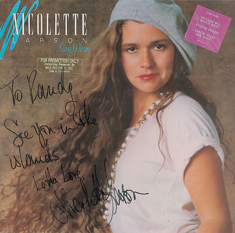 Singer (1952-1997) best known for her 1978 cover of Neil Young's ‘Lotta Love.’ Promotional copy of her …Say When album signed and inscribed on the front cover in black felt tip, “To Randy, See you in the islands! Lotta love, Nicolette Larson.” In fine condition, with promotional stamp and label to front cover. The record is not included.