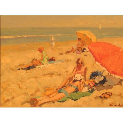 Niek van der Plas - Dutch impressionist (1954 - ) Oil on wood panel beach scene shows two girls with red white fringed umbrella on a sandy beach. Blue ocean with a white sail is seen on horizon. Signed lower right. Also signed on reverse. Born in 1954 in the Netherlands, van der Plas is a popular contemporary artist wokring in the impressionist style. Measuring 11-1/2? x 15-1/2?. Housed in a fine gesso decorated frame with linen liner.