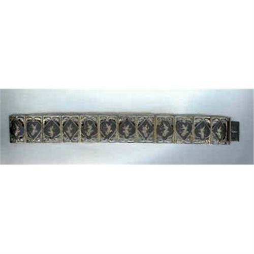 7" long without the clasp this bracelet will fit a 7" wrist. Beautiful panels of Niello enamel In Heart, Diamond, Spade and Club designs. Original box is included that is rather worn. The box is signed on the inside of the lid as follows:- YAPKUIKEE JEWELLERS, 1278 CORNER OF ORIENTAL AVE, BANGKOK, THAILAND, NIELLO, SILVERWARE.