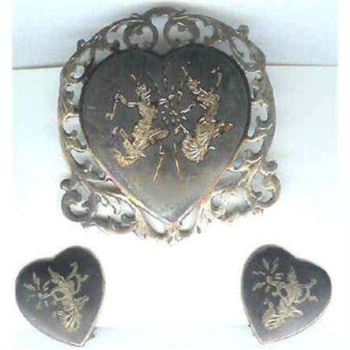 Heart shaped clip earings marked "Siam Sterling." also a heart shaped Brooch also marked "Siam Sterling." circa 1960. The pinmeasures 1.7/8" X 1.3/4" and the earings 3/4" x 1/2". Not cleaned. No damage.Many people believe that items marked Siam