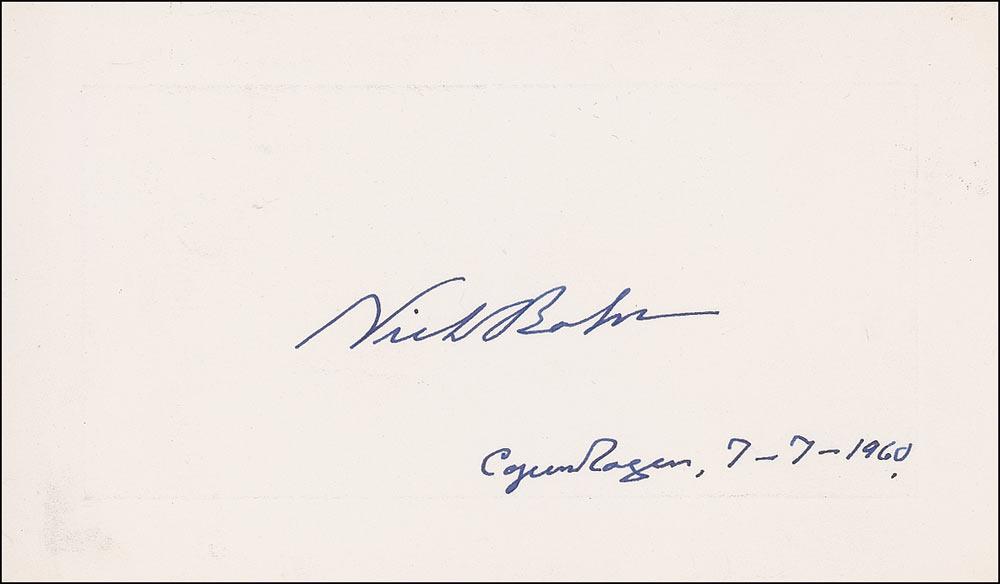 Danish physicist (1885–1962) who was awarded the 1922 Nobel Prize in Physics for his theory of atomic structure. Ink signature, “Niels Bohr, Copenhagen, 7–7–1960,” on a white double weight 5.75 x 3.5 custom-made collector's card (similar in look to an invitation card). In fine condition.